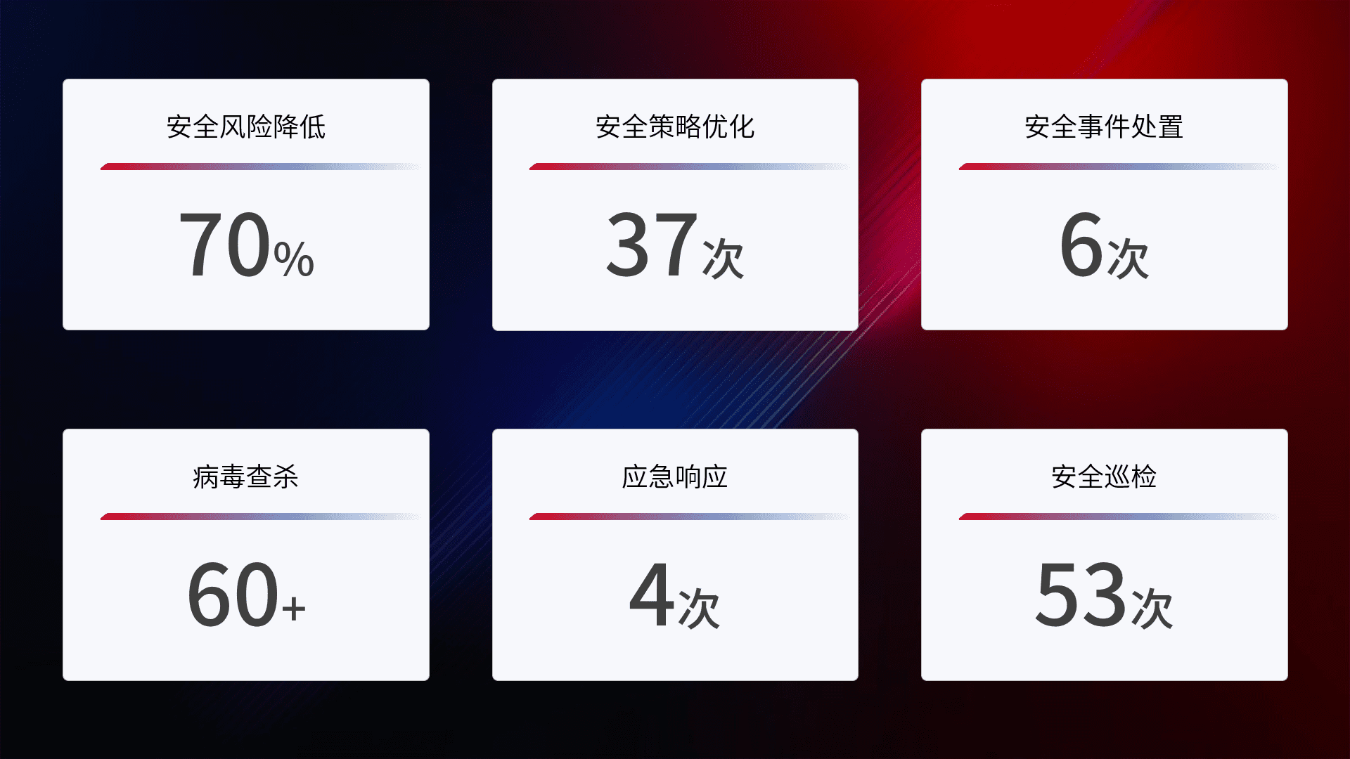 提供全面的安全事件报告体系,,包括处置报告、、周报、、、、季度和年度总结,,,结合持续监控,,帮助客户深入了解网络安全状况。。。