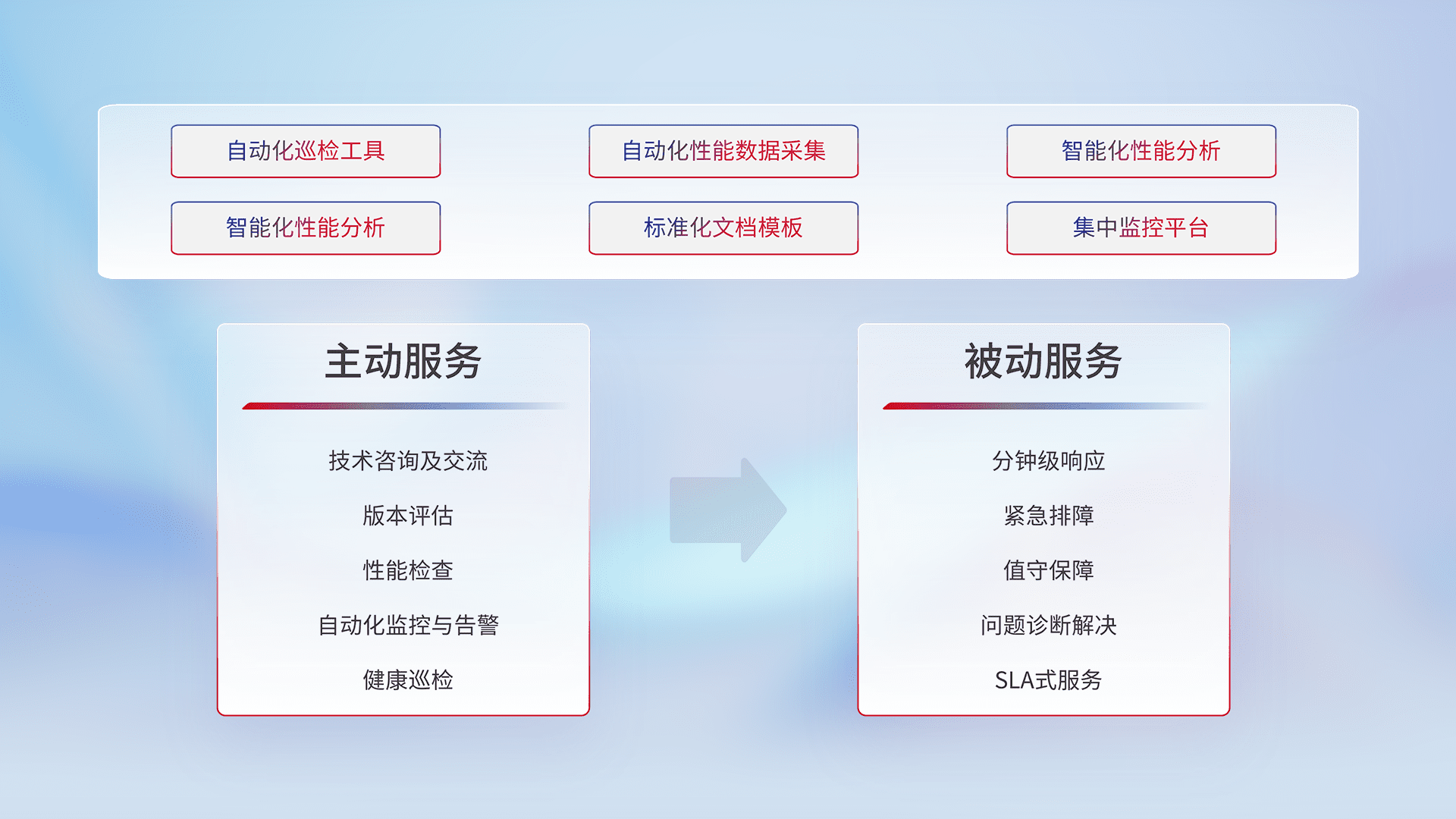 智能化工具和标准化文档,,,,保障服务质量,,,,提供主动服务(包含技术咨询、、版本评估、、性能检查、、自动化监控与告警、、、健康巡检)和被动服务包含(分钟级响应、、紧急排障、、、、值守保障、、问题诊断解决、、、SLA服务)。。。。